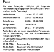 Die Termine für die Ferien sowie für die Beweglichen Ferientage im aktuellen Schuljahr finden Sie hier.